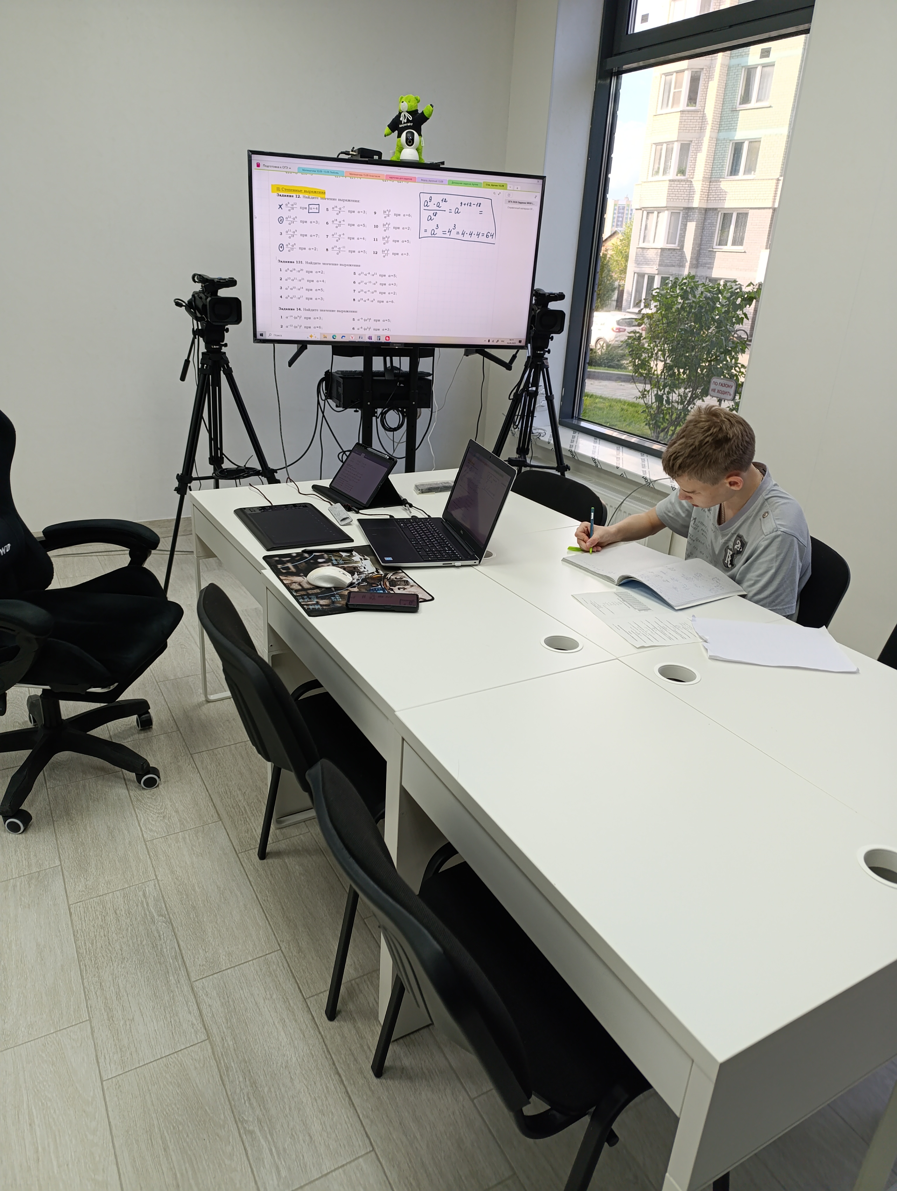 Обычно здесь сидит группа из шести человек. Все, кроме вот этого одного стойкого, сидят по домам с соплями и кашлем, и я провожу занятие онлайн. Обычно я у доски стою или сижу за компом, но за другим столом. А тут перебралась поближе к ученику и к большому экрану для удобства трансляции.  У нас командная работа - когда один отвечает, его все должны слышать. Вот и сидим теперь со Стасом (это вот этот парнишка) как на спиритическом сеансе🤣🤣🤣